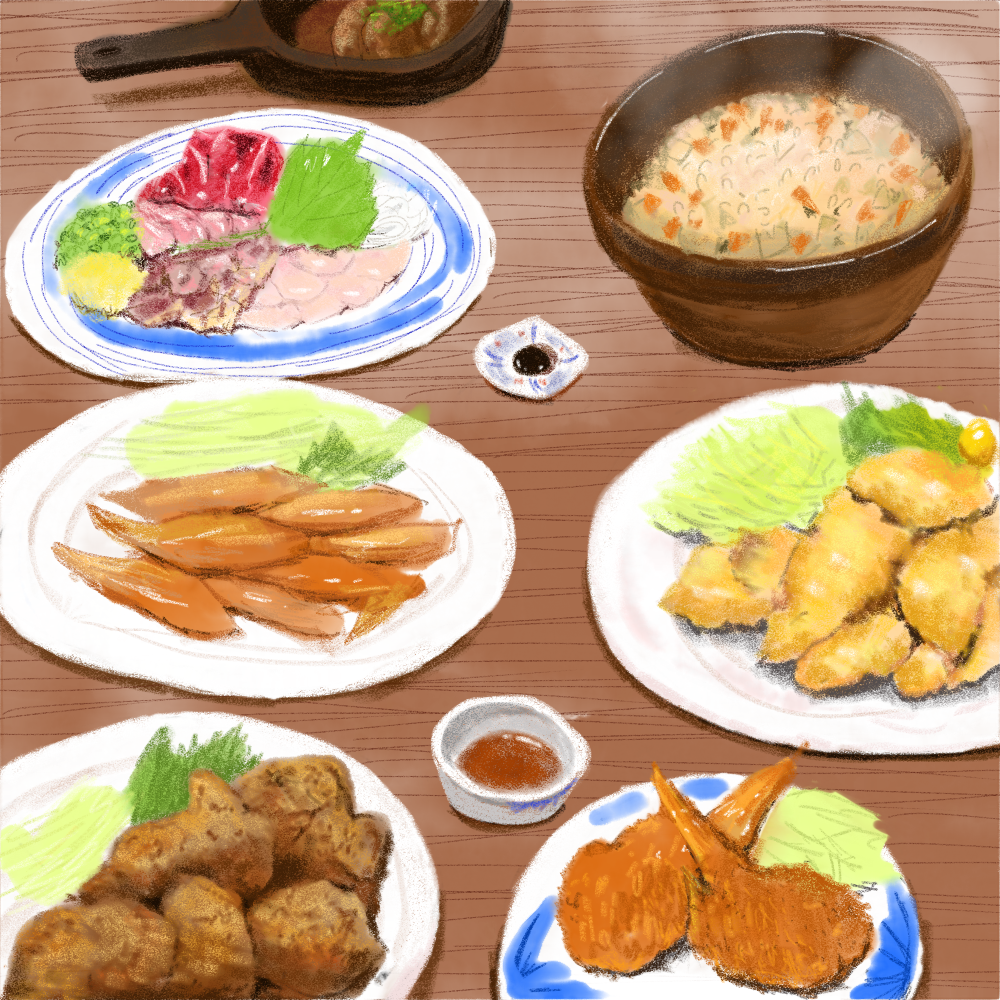 ここの名物料理「おふくろ」は、手羽餃子のような一品で、みんなに愛される人気メニューです。